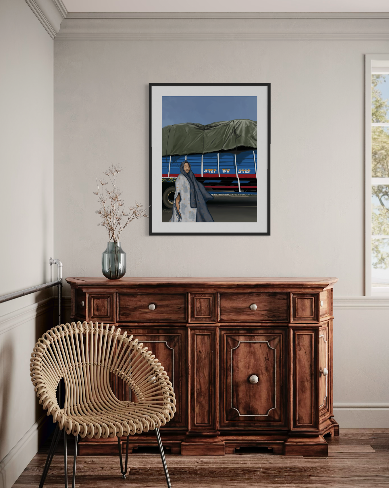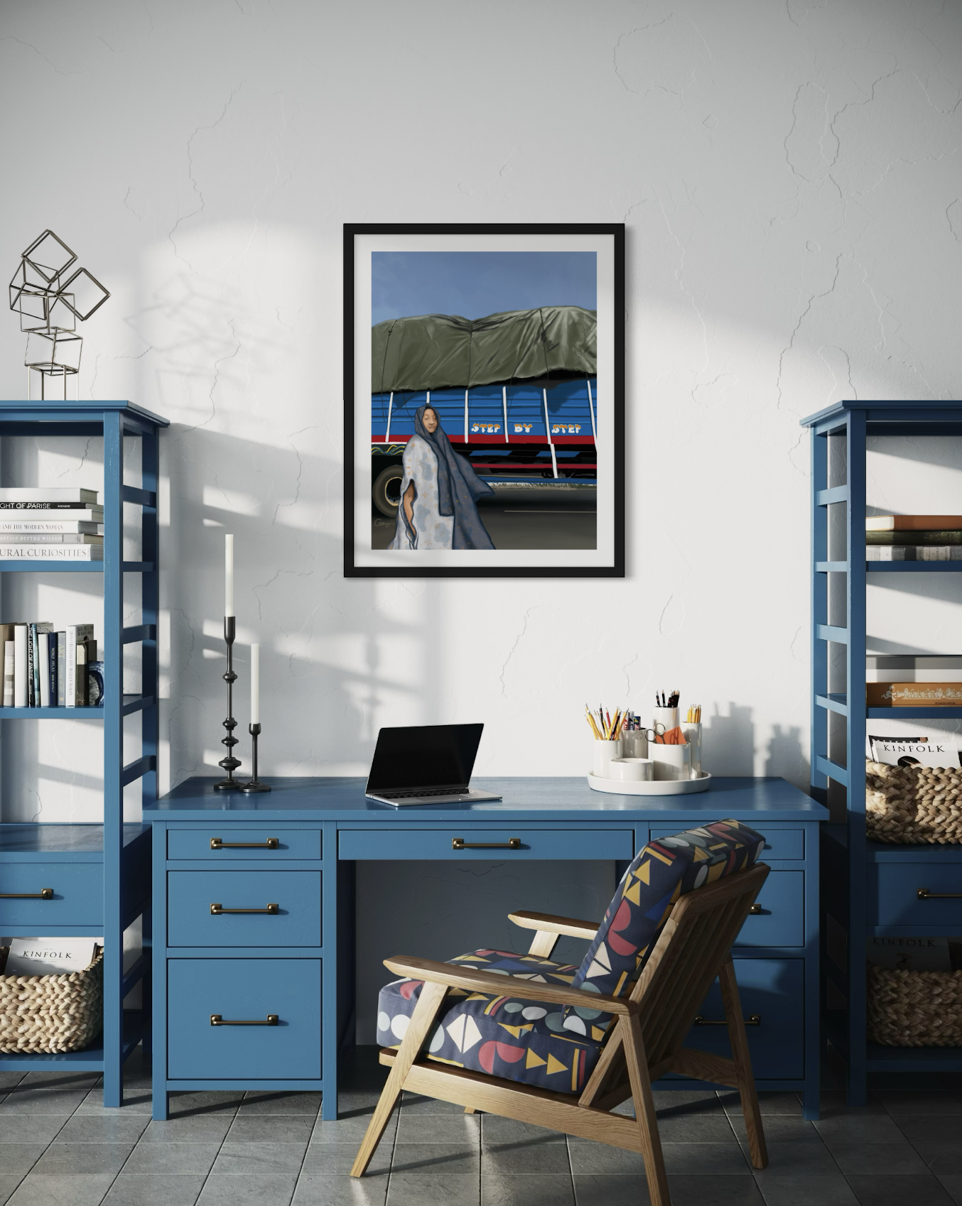 ‘Step By Step’ is a vivid and colourful reminder of the journey of life. The soft brushstrokes depict minimal clouds scattered across a clear sky, symbolising brighter days. The bulky truck with a green tarp concealing its load drifts across the background, representing the weights and burdens carried along one’s path. In contrast, the woman stands stoically, dressed in a patterned, light-blue, flowing dress, as her scarf dances whimsically in the wind, and her gaze almost meets the viewer’s. She embodies and conveys resilience.